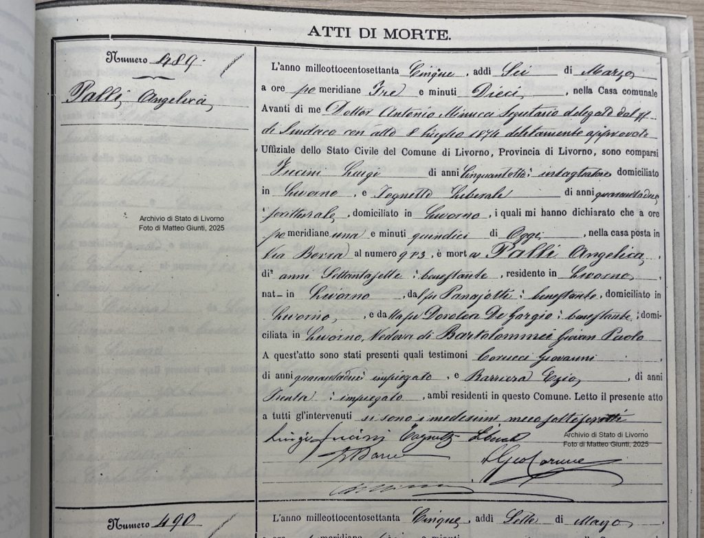 Ho dunque anzitutto verificato la data di morte tramite il suo atto di morte conservato in copia presso l’Archivio di Stato di Livorno e che riporto qui sotto: